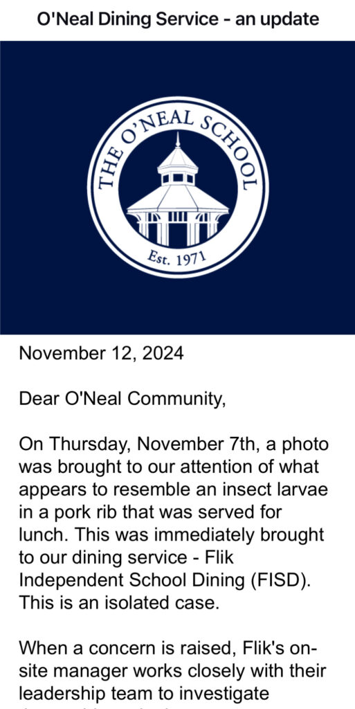 Parents have reported that their children are unhappy with the meal program (even before the barbequed larvae incident) noting that it often fails to meet even basic personal expectations. Students have described long lunch lines, lukewarm food by the time they’re served, and rushed meals within a brief lunch period. For some, lunch has become a matter of discarding unappetizing food and raiding the pantry as soon as they get home. Despite numerous complaints, O’Neal’s social media showcases the new dining service as a universally positive change, creating yet another stark contrast between the school’s polished image and the daily experiences on campus.